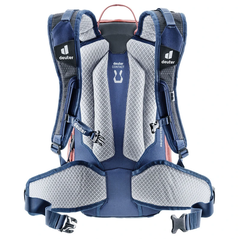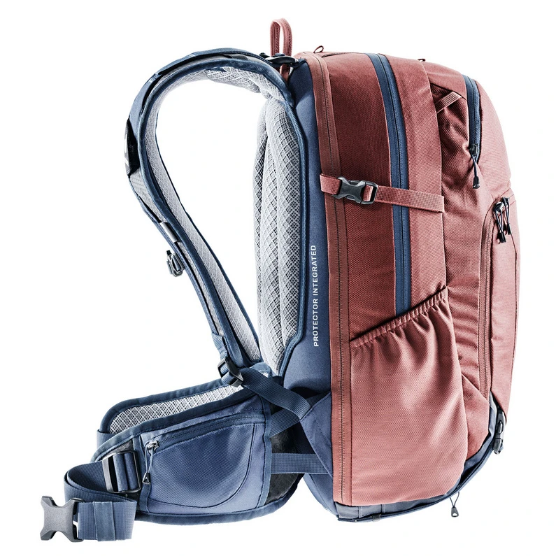 Doordachte fietsrugzak met veel details, geïntegreerde rugbeschermer en draagfunctie voor de fiets